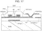 Further, over the whole area of a central portion of the pixel region, except for a trivial peripheral portion of the pixel region, the counter electrode CT, which is made of ITO1 (Indium-Tin-Oxide), for example, and constitutes a transparent conductor, is formed. In this embodiment and embodiments 12 to 15, which will be explained later, a profile of the counter electrode CT (ITO1) which is formed of a transparent conductor mounted on a substrate main surface side is depicted with a bold line. The counter electrode CT (ITO1) is partially covered with other transparent conductor films (pixel electrodes PX (ITO2)) which are disposed away from the main surface of the substrate. As the transparent conductor, in place of ITO used in this embodiment, a conductive film which is formed such that the film can irradiate an incident light with a sufficient intensity (for example, a film which is capable of transmitting at least 60% of an incident light), such as a metal thin film made of IZO (Indium-Zinc-Oxide) or formed by ion coating, for example, may be used.