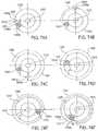 Referring now toFIG. 74B, thedisk1314 may be rotated while theball1332 remains in place. Here, thedisk1314 has rotated 90 degrees, as indicated by arrow36000 and the position of the groove ends1354a,1354b. Referring now toFIG. 74C, thedisk1314 may be further rotated while theball1332 remains in place. Here, thedisk1314 has rotated 270 degrees, as indicated by arrow36000 and the position of the groove ends1354a,1354b. Thedisk1314 may continue rotating to 360 degrees, as shown inFIG. 74D, indicated by arrow36000. Here, thefirst groove end1354ain thedisk1314 has contacted theball1332 and pushes theball1332 alonggroove1326 in the base. Referring now toFIG. 74E, thedisk1314 may be further rotated while theball1332 is pushed along thegroove1326 in thebase1308 by thefirst groove end1354ain thedisk1314. Here, thedisk1314 is shown to have rotated 540 degrees. Referring toFIG. 74F, thedisk1314 rotates until theball1332 reaches thesecond groove end1350bof thebase1308, providing a hard stop. In this position, theball1332 is held between thefirst groove end1354aof thedisk1314 and thesecond groove end1350bof thebase1308 and further rotation of thedisk1314 is prevented. Thus, thedisk1314 was rotated approximately 660 degrees in this example. Any maximum degree of rotation may be set by positioning of groove ends1350a,1350band/or groove ends1354a,1354b. Additionally, in some embodiments, rotation can be limited by adding more than oneball1332 to thegroove1326, for example, two, three, four, five, six, seven, eight, nine, ten or more balls may be used to limit travel and hence curvature.