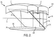 It is noted that if the imaging optical element was simply a spherical mirror, instead of lens L1 (with a refractive surface facing theimage generator24 and a reflective back surface), the resultant field would be very out of focus. This defocusing can be addressed by significantly reducing the field of view. However, as shown by the embodiments described herein by having an optical component L1, L2 that has a refractive as well as a reflective lens surface (which are, in this embodiment both aspheric) we can correct the image aberrations (across the pupil and the field) and obtain a well focused image even when the field of view exceeds 40 degrees. Because the light from theimage generator24 passes through therefractive surface22 twice, lens L1 provides an equivalent of three aspheric surfaces, enabling correction of several optical aberrations over a wide field of view that exceeds 40 degrees via a simply, single, compact, light weight element. In some embodiments, one or more of the aspheric surfaces can have different factors such as radii of curvature, conic constants or other factors (e.g., A, B and C aspheric coefficients which will be described further below) that define the optical properties of the aspheric surfaces. In some embodiments, all aspheric surfaces may have such differing radii of curvature and/or other factors.