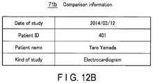 FIG. 12B shows an example of comparison information prepared based on the file information depicted inFIG. 12A. Thecomparison information71bincludes the date of study, client ID and client name which are supposed based on the information collected by theimage data collector45, and the kind of study which is supposed based on the information collected by themetadata collector44. The date of study, patient ID, patient name and kind of study of thecomparison information71bare “2014/Mar./12”, “401”, “Taro Yamada” and “electrocardiogram examination”, respectively.