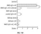 FIGS. 11A-B. Aquaporumab reduces NMO-like lesions produced by NMO-IgG and human complement in ex vivo spinal cord slice cultures. (FIG. 11A) Ex vivo spinal cord slice culture model in which slices were cultured for 7 days, followed by 3 days in the presence of NMO-IgG (purified IgG from NMO serum) and human complement, without or with aquaporumab (Aqmab). Immunostaining shown for AQP4, GFAP and myelin. Controls include non-NMO IgG, NMO-IgG or Aqmab alone, Aqmab with complement, and slice cultures from AQP4 null mice. (FIG. 11B) NMO lesion scores (see Methods) (S.E.M., n=4-5, P<0.001)