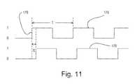 FIG. 11 is a timing diagram of afirst output signal176 and asecond output signal178 of the transmissiveoptical sensor circuit156. The output signals176,178 are provided to thecontroller152 as a train of pulses. The frequency, and thus the period T, of the pulses of the output signals176,178 is a function of the rotational speed of the motor output shaft172. The relative spacing S between the pulses of the first and second output signals176,178 is a function of rotational direction. When themotor150 is rotating in a clockwise direction of the output shaft172, thesecond output signal178 lags behind thefirst output signal176 by the relative spacing S. When themotor150 is rotating in the opposite direction, thesecond output signal178 leads thefirst output signal176 by the relative spacing S.