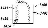 FIG. 14A shows a piece of absorbent material orgauze1400 similar or even identical to those previously described and illustrated, with first and second radio-opaque material1422,1424 and awireless transponder1426.