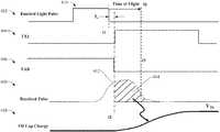 While the pulse measuring cycle illustrated inFIG. 7 describes the use of two separate measuring capacitors—FD1 and FD2—to capture the respective leading and trailing portions of the reflectedpulse704, some alternative embodiments may employ only a single measuring capacitor to capture both the leading and trailing portions of the reflectedpulse704 using two different measuring sequences. In such embodiments, the single-capacitor baseline architecture depicted inFIG. 3 can be used to capture both leading and trailing portions by varying the timing of the signals and other parameters as appropriate. For example, a first measuring cycle can capture the leading portion of the pulse by controlling TX1 (the sole control line that controls transfer of charge from the photo-device to the sole measuring capacitor) using the TX1 control signal timing shown inFIG. 7, whereby the control signal is held high from a time prior to emission of thepulse702 until thesampling time706. This measuring cycle can be repeated for N cycles, yielding a measurable amount of charge that is proportional to the leading portion of the receivedpulse704. This leading portion charge can then be read from the measuring capacitor, and the capacitor is cleared. In a subsequent measuring sequence, TX1 is controlled according to the TX2 timing shown inFIG. 7, such that the TX1 signal switches from low to high at thesampling time706, and is held high for a defined duration that allows the trailing portion of the receivedpulse704 to be captured. This measuring cycle is repeated for N cycles to yield a measurable charge proportional to the trailing portion of the receivedpulse704. This trailing portion charge is then read from the measuring capacitor, and the capacitor is cleared again.