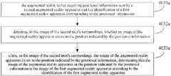 Then, inStep4032b, when the image of the augmented reality apparatus exists in the image of the second user's surroundings, detecting whether there is the identification pattern in the image of the augmented reality apparatus. In some embodiments, the augmented reality server may store the correspondence relationship between the identification of the augmented reality apparatus and the identification pattern. When the image of the augmented reality apparatus exists in the image of the second user's surroundings, the augmented reality server may determine the identification pattern corresponding to the first augmented reality apparatus according to the correspondence relationship between the augmented reality apparatus and the identification pattern, and detect whether the identification pattern corresponding to the first augmented reality apparatus exists in the image of the augmented reality apparatus which is in the image of the second user's surroundings. Alternatively, the identification pattern may be encoded with an identification of the augmented reality apparatus. When the augmented reality server detects an identification pattern exists in the image of the second user's surroundings, it can decode the identification pattern and obtain the identification of the augmented reality apparatus corresponding to the identification pattern, and then judge whether the identification of the augmented reality apparatus corresponding to the identification pattern is the identification of the first augmented reality apparatus.