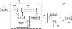 Thesystem controller160 receives the results from thecontrol circuit150 based on at least one of the first or second echo pulses received during the excitation interval. Areceiver circuit170 has aninput174 to receive the echo pulses and anoutput176 to thecontrol circuit150. Thereceiver input174 receives the electrical receive signal from T1 of theultrasonic transducer110 in response to an ultrasonic echo signal reflected from theobject130. Thereceiver output176 provides an amplified output signal based on the electrical receive signal. A dashedline180 indicates that in some examples, thetransmitter circuit140, thecontrol circuit150, thereceiver170, and/or theport154 can be implemented on a common substrate of an IC chip where thesystem controller160 and thetransducer110 are external to the chip. In other examples, discrete circuit implementations may be provided in thesystem100.