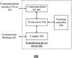 Thetransmission device101 or102 includes anoptional training controller230. In an example embodiment, thetraining controller230 is implemented by a standalone processor or a processor that is shared with one or more other components of thetransmission device101 or102. Thetraining controller230 selects the carrier frequencies, modulation schemes and/or guided wave modes for the guided electromagnetic waves based on feedback data received by thetransceiver210 from at least one remote transmission device coupled to receive the guided electromagnetic wave.