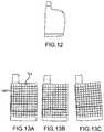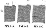 Example 4—Comparison of Electrolyte Diffusion Times of Corrugated and Non-Corrugated ElectrodesElectrolyte diffusion rates for corrugated and non-corrugated electrodes as well as laminated cell stacks were determined. The electrolyte diffusion rates showed rapid electrolyte diffusion within the laminated stacked cells. The evaluations involved placing an electrode stack or stacked electrodes within an electrochemical energy storage device and/or system or a series of stacked electrode pairs in an electrolyte bath and monitoring the wicking rate. Electrolyte diffusion rates were determined for electrodes lacking micro-channels and/or micro-grooves and for electrodes having different types of micro-channels and/or micro-grooves.FIG. 12 depicts the degree of electrolyte wicking for an electrode lacking, that is devoid of, any micro-channels and/or micro-grooves. The horizontal line drawn across the electrode shows the level of electrolyte wicking after 300 seconds of emersion of the electrode edge in the electrolyte. The horizontal line was substantially at about the line where the electrode contacted the electrolyte. Hence, the electrolyte was not substantially wicked, if any, by the electrode lacking, that is electrode devoid of micro-channels and/or micro-grooves.FIGS. 13A-B and14A-C depict the degree of electrolyte wicking for electrodes having micro-channels and/or micro-grooves. The horizontal lines drawn across the electrodes, going from left to right, are height that the electrolyte wicked after 30, 60 and 300 seconds immersion in the electrolyte, respectively. The micro-channels and/or micro-grooves of the electrode ofFIG. 13A (left image) and13B (right image) (shown ashorizontal lines1300 andvertical lines1304 laid out in a grid- or checker-board pattern) were 4 mm spaced corrugations, and the electrolyte migration was dispersed laterally with time as electrolyte was directed along the 4 mm spaced micro-channel and/or micro-groove corrugations. The micro-channels and/or micro-grooves for the electrode ofFIGS. 14A (left image),14B (middle image) and14C (right image) (shown ashorizontal lines1308 andvertical lines1312 laid out in a grid- or checker-board pattern) were 1 mm spaced corrugations. Compared to the electrolyte wicking of electrode having the 4 mm spaced corrugations (FIG. 13A-B), the electrolyte wicking for the electrode having 1 mm spaced micro-channel and/or micro-groove corrugations, the electrolyte wicked along the entire width of electrode. It is believed that the electrolyte migration proceeded along the entire width of electrode due to closer spacing of the 1 mm micro-channels and/or micro-grooves, compared to 4 mm spaced micro-channels and/or micro-grooves.