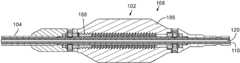 Referring toFIGS. 8A and 11, theflex control mechanism168 can comprise a rotatable housing, or handle portion,186 that houses aslide nut188 mounted on arail192. Theslide nut188 is prevented from rotating within the housing by one ormore rods192, each of which is partially disposed in a corresponding recess within therail192 and a slot or recess on the inside of thenut188. The proximal end of thepull wire162 is secured to thenut188. Thenut188 has external threads that engage internal threads of the housing. Thus, rotating thehousing186 causes thenut188 to move axially within the housing in the proximal or distal direction, depending on the direction of rotation of the housing. Rotating the housing in a first direction (e.g., clockwise), causes the nut to travel in the proximal direction, which applies tension to thepull wire162, which causes the distal end of the delivery apparatus to bend or flex. Rotating the housing in a second direction (e.g., counterclockwise), causes the nut to travel in the distal direction, which relieves tension in thepull wire162 and allows the distal end of the delivery apparatus to flex back to its pre-flexed configuration under its own resiliency.
