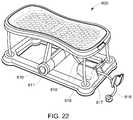 Various additional exemplary embodiments further contemplate utilizing a resistance mechanism that is positioned at the pivot P, as disclosed, for example, in International Patent Application No. PCT/US2019/015031, entitled “Devices and Methods for Exercising an Ankle, foot, and/or Leg, and filed on Jan. 24, 2019, the entire contents of which are incorporated by reference herein. Such resistance mechanisms may include, for example, but are not limited to friction devices, torsion bars, spring devices (e.g., torsion springs/linear springs), compliant mechanisms, detent dials, adjustable clutch mechanisms, piezoelectric/nanomotion motors, pneumatic, and/or hydraulic devices, such as, for example, hydraulic cylinders (see below), viscous damping devices, and/or devices utilizing smart fluids, such as, for example, magnetorheological fluids or electrorheological fluids. Various exemplary embodiments of the present disclosure additionally contemplate a portable exercise device that includes a triple hinge that may, for example, also function as the support. In such embodiments, the triple hinge may also incorporate the resistance mechanism. And, as illustrated inFIG. 22, for example, various further exemplary embodiments contemplate aportable exercise device600, which includes molded hinges609 (not shown in the view ofFIG. 22) and611 that are integral with acollapsible support610. Thecollapsible support610 may, for example, be made from a molded plastic material with thehinges609 and611 and/or locking mechanisms molded into it. In such a configuration, the molded hinge609 could also house an adjustable resistance mechanism, such as, for example, one of the resistance mechanisms disclosed in International Patent Application No. PCT/US2019/015031. The resistance mechanisms and the respective ranges of resistance for the resistance mechanisms disclosed in International Patent Application No. PCT/US2019/015031 are incorporated herein by reference.