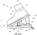 Similar to the embodiment ofFIGS. 1-7, in the exemplary embodiment ofFIGS. 18-21, in the “neutral position”, when in the first, open in-use configuration, therectangular body507a, acting as thepedal501, is substantially parallel to therectangular body507b, acting as thebase502. With reference toFIGS. 43A and 43B, therectangular body507ais configured to rotate about the pivot axis P in a first direction away from the neutral position N and toward therectangular body507band in a second direction away from the neutral position N and toward therectangular body507b, wherein the second direction is opposite the first direction. Thus, in such a configuration, similar to the embodiment ofFIGS. 1-7, therectangular body507ais configured to undergo a first type of motion, a rocking type of motion in which therectangular body507arotates about the pivot axis P, while thesupport510 is held in a fixed position. In other words, like the embodiment ofFIGS. 1-7, the pivot axis P is directly adjacent to a foot of a user, such that therectangular body507aby itself rotates about the pivot axis P, in a first direction F away from the neutral position N (seeFIG. 43A) in which a toe end portion moves toward therectangular body507b(and the heel end portion moves away from therectangular body507b) and in a second direction E (seeFIG. 43B) away from the neutral position N in which the heel end portion moves toward therectangular body507b(and the toe end portion moves away from therectangular body507b). In this manner, while in the first, in-use configuration, therectangular body507amoves in a pivot, with rotation around the pivot axis P provided by the hinge509 (i.e., the active hinge is located at the top of thesupport510 and adjacent the foot121), and, as illustrated inFIG. 14, the user'sankle141 also must pivot around this axis in an arc C. Thus, while in the first, in-use configuration, the movement of therectangular body507asubjects thefoot121 of theuser123 to a first motion, which comprises pivoting thefoot121 about theankle122, while moving theankle141 in the arc C.