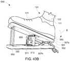 And, when thedevice500 is flipped over and in the second, open in-use configuration, in the “neutral position”, therectangular body507b, acting as thepedal501 is substantially parallel to therectangular body507a, acting as thebase502. With reference toFIGS. 44A and 44B, therectangular body507bis configured to rotate about the pivot axis P, via thesupport510, in a first direction away from the neutral position N and toward therectangular body507aand in a second direction away from the neutral position N and toward therectangular body507a, wherein the second direction is opposite the first direction. Thus, in such a configuration, therectangular body507bis configured to undergo a second type of motion, a combination motion in which therectangular body507btravels forward and aft while also rotating about the pivot axis P (i.e., via its attachment to the support510). In other words, since thesupport510 is also allowed to rotate in the second, open in-use configuration (i.e., relative to the base502), therectangular body507bmoves in a different motion with relation to the pivot axis P in comparison to the motion of therectangular body507awhen thedevice500 is in the first, open in-use configuration (i.e., when thesupport510 is held fixed relative to the base502). Indeed, in this configuration, the pivot axis P is lowered (i.e., relative to the first, open in-use configuration) and is spaced away from a foot of a user such that thesupport510 rotates about the pivot axis P, and therectangular body507b(which is connected to thesupport510 at the hinge511) moves in a first direction F away from the neutral position N (seeFIG. 44A) in which a toe end portion moves toward therectangular body507a(and the heel end portion moves away from therectangular body507a) and in a second direction E (seeFIG. 44B) away from the neutral position N in which the heel end portion moves toward therectangular body507a(and the toe end portion moves away from therectangular body507a). In this manner, therectangular body507bmoves in a forward and aft motion, with rotation around the pivot axis P provided by the hinge509 (i.e., the active hinge is located at the bottom of thesupport510 and spaced away from the foot121). Thus, while in the second, in-use configuration, the movement of therectangular body507bsubjects thefoot121 of theuser123 to a second motion, which comprises pivoting thefoot121 about theankle122, while also subjecting theankle122 to a forward and aft rocking motion.