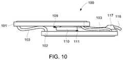 As illustrated inFIGS. 8-12, in the closed configuration of thedevice100, thepedal101 is collapsed against thebase102, reducing the space S between the pedal101 and thebase102, such that thedevice100 has a minimized profile. In this configuration, thesupport110 is in a collapsed position in which thesupport110 is parallel to theparallel bodies106,107 of thepedal101 and thebase102. In other words, in the closed configuration of thedevice100, thecord116 of theclosure mechanism115 is slack such that thepedal101 andsupport110 can pivot, via thehinges109 and111, to collapse and lay flat against thebase102. Consequently, in this configuration, theelastomeric bands103 are also substantially slack and collapsed with respect to thebase102, as further illustrated inFIGS. 8-12.