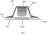 Turning now toFIG. 7, a more detailed view of an exemplaryforce direction element203 andsensor arrangement207 for use in the control mechanism of the present disclosure is shown. In this arrangement theforce direction element203 comprises two main portions. Thefirst portion203acomprises an elastomer dome switch, while thesecond portion203bcomprises an elastomer pillar. Theelastomer dome switch203ais configured to bend under pressure exerted from above by a key201 being depressed by a user. This flexing of thedome switch203apushes thepillar203bdownward onto apressure sensor207 provided beneath thepillar203b. Further downward force then compresses theelastomer pillar203b. Because both thedome switch203aandpillar203bare elastic in this arrangement, they each provide a returning force on the key201 which resists depression of the key201 and acts to return the key201 towards its rest position. Thedome switch203aandpillar203bthereby provide tactile feedback to the user during key depression.