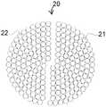 InFIG. 2, a first embodiment of amultifilament20 according to the present invention is schematically illustrated in cross-section. The multifilament20 comprises a first type ofindividual filaments21 and second type ofindividual filaments22. In this particular embodiment, the multifilament20 has a generally circular composite cross-section, whereof theindividual filaments21 of the first type contribute to about fifty percent (50%) of the total composite cross-sectional area and whereof theindividual filaments22 of the second type contribute to the remaining fifty percent (50%) of the total composite cross-sectional area. More specifically, thefilaments21 of the first type occupy about a full semi-circle (at the right-hand side inFIG. 2) of the total composite cross-section, and thefilaments22 of the second type occupy the complementary full semi-circle (at the left-hand side inFIG. 2) of the total composite cross-section.