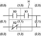 FIG. 6 is a diagram illustrating the circuit elements included in the selected range S1 selected in the ladder programediting support apparatus100 according to the embodiment of the present invention.FIG. 6 represents auxiliary lines H around the circuit element by dotted lines, and represents the coordinate positions in theprogram edit region22 in the rectangular coordinate system notation in the grid area in a manner of (0, 0), (2, 2), and so on.