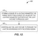 In view of the above, particular embodiments of the present disclosure include various methods of controlling alight fixture10 implemented by afixture configuration module32. An example of such amethod400 is illustrated inFIG. 12. Themethod400 comprises storing a range of a lighting parameter (block410). The range identifies at least a subset of values of the lighting parameter supported by thelight fixture10 to produce light. Themethod400 further comprises controlling thelight fixture10 to produce the light in accordance with the stored range (block420).