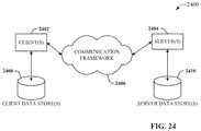 FIG. 24 is a schematic block diagram of a sample computing environment2400 with which the disclosed subject matter can interact. The sample computing environment2400 includes one or more client(s)2402. The client(s)2402 can be hardware and/or software (e.g., threads, processes, computing devices). The sample computing environment2400 also includes one or more server(s)2404. The server(s)2404 can also be hardware and/or software (e.g., threads, processes, computing devices). Theservers2404 can house threads to perform transformations by employing one or more embodiments as described herein, for example. One possible communication between aclient2402 andservers2404 can be in the form of a data packet adapted to be transmitted between two or more computer processes. The sample computing environment2400 includes acommunication framework2406 that can be employed to facilitate communications between the client(s)2402 and the server(s)2404. The client(s)2402 are operably connected to one or more client data store(s)2408 that can be employed to store information local to the client(s)2402. Similarly, the server(s)2404 are operably connected to one or more server data store(s)810 that can be employed to store information local to theservers2404.