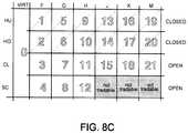 FIG. 8B illustrates a somewhat moreelaborate grid502. Thegrid502 lists three products on its leftmost column, namely, unleaded gasoline (HU), heating oil (HO) and crude oil (CL). Again, the virtualcontract grid element505 is numbered0. Three real delivery months are listed on the uppermost row, namely, F, G and H. Also shown is a virtual delivery period (VFGH), corresponding to the months of a first quarter strip. For purposes of this illustration, there is no January CL contract. Accordingly,grid elements503 and504 are shaded and unnumbered to illustrate that no contract is associated withgrid elements503 and504. An order element may not be placed ingrid elements503 or504. Again, each grid element has a unique number associated with it.