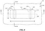 FIG. 8 is a schematic top plan view of a portion of a wafer-level interconnect assembly401 (“assembly401”) including abond pad assembly402 and an interconnect structure in the form of apillar400. Thepillar400 has first and second ends410,412 and an elongatedmain body414 extending between the first and second ends410,412. Alongitudinal axis420 of thepillar400, as viewed from above, can be generally perpendicular tolongitudinal axes430a,430bofrespective openings440a,440b(illustrated in phantom). Thepillar400 can have a generally oblong shape (e.g., a rectangular shape, an elliptical shape, etc.) to ensure that thepillar400 covers bothopenings440a,440b. The pillar440 can be generally centered over an underlying bond pad for generally vertical stacking, thereby avoiding offset die stacking. A length L can be about two times, three times, four times, five times, or ten times the width W of thepillar400. Other dimensions are also possible.
