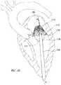 Theimplant110 is shown in the figures to include a plurality of struts arranged such that adjacent pairs of struts are joined to form upper and lower apices.Implant110 may include piercingmembers115 proximate the lower portion ofimplant110, for example coupled to each lower apex, proximatemitral valve170, for example, the mitral valve annulus. Piercingmembers115 may include barbs or hooks similar to fish hook barbs or other similar feature to resist withdrawal from tissue once pierced. Piercingmembers115 may include a single barb or hook, or a plurality of barbs or hooks per piercingmember115. Piercingmember115 may be immediately exposed or covered for delivery. They may number from one to fifty and may have a length of about four to twenty millimeters in length. They may have the same wall thickness as a wall of the tubular body ofimplant110 or may differ with an increased or decreased thickness or taper in either direction to allow for mechanical integrity.