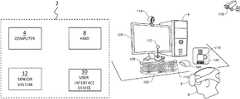 A space near or on any of the objects can be designated as a gesture space. For example, a determine three-dimensional volume of airspace above the keyboard can be used for hand gestures which can be interpreted as commands forcomputer4 for a user to interact with a virtual reality environment. Multiple gesture spaces can be defined. For example, a gesture near themouse104 may have a different meaning, or use different gestures, than gestures over thekeyboard102 or on thedisplay106. More description is provided below.