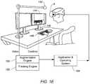FIG. 1E is a high level diagram of an augmentation and tracking system operation. Acamera142 can provide video to anaugmentation engine150 and atracking engine152. Video from other cameras, and/or other sensing data from other sensors can be provided. The video and other sensing data can be used for two purposes. First, the video and/or sensor data is used to provide a realistic (e.g., “real world representation) display of one or more peripherals and the user's hands in the virtual reality environment. Second, the video and/or sensor data is used to track the user movements with respect to the peripherals.