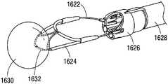An alternate expandable mechanical stabilizing structure is illustrated inFIGS. 47A-47C. In this embodiment, instead of a mesh structure, a stent-like structure1612 is provided formed by a plurality of struts interconnected to form a plurality of geometric shapes.Stent structure1612 is positioned within the distal end ofcatheter1614 which is slidably received in the lumen of thecatheter1510 in the same manner ascatheter1574 described above. Anactuator1616, such as a push or pull rod, is slidably received within the lumen ofcatheter1614 and attached to thestent structure1612, e.g. at a distal end, to move thestent structure1612 between the collapsed and expanded positions. The system1610 is the same assystem1510 except for the stabilizing feature, therefore for brevity the same features are not described. Thestent structure1612 is initially positioned distal of thedistal coupler1548. Thecatheter1614, likecatheter1574, slidably extends through alumen1513 incatheter1510 which can be a separate lumen or alternatively a region of the lumen that receives the endoscope and/or a tool channel.