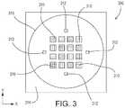 Thedetectors312 may be placed close to each edge of the array ofemitters310 and/or and in the middle of the array ofemitters310 and may be connected in parallel to a receiver of the illumination device10. Similar to theemitters310, thedetectors312 are LEDs that can be used to emit or receive optical or electrical signals. When thedetectors312 are coupled to receive optical signals and emit electrical signals, thedetectors312 may produce current indicative of incident light from, for example, an emitter, a plurality of emitters, or a chain of emitters. Thedetectors312 may be any device that produces current indicative of incident light, such as a silicon photodiode or an LED. For example, thedetectors312 may each be an LED having a peak emission wavelength in the range of approximately 550 nm to 700 nm, such that thedetectors212 may not produce photocurrent in response to infrared light (e.g., to reduce interference from ambient light).