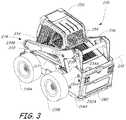 FIGS. 2-3 illustrate aloader200, which is one particular example of a power machine of the type illustrated inFIG. 1 where the embodiments discussed below can be advantageously employed.Loader200 is a skid-steer loader, which is a loader that has tractive elements (in this case, four wheels) that are mounted to the frame of the loader via rigid axles. Here the phrase “rigid axles” refers to the fact that the skid-steer loader200 does not have any tractive elements that can be rotated or steered to help the loader accomplish a turn. Instead, a skid-steer loader has a drive system that independently powers one or more tractive elements on each side of the loader so that by providing differing tractive signals to each side, the machine will tend to skid over a support surface. These varying signals can even include powering tractive element(s) on one side of the loader to move the loader in a forward direction and powering tractive element(s) on another side of the loader to mode the loader in a reverse direction so that the loader will turn about a radius centered within the footprint of the loader itself. The term “skid-steer” has traditionally referred to loaders that have skid steering as described above with wheels as tractive elements. However, it should be noted that many track loaders also accomplish turns via skidding and are technically skid-steer loaders, even though they do not have wheels. For the purposes of this discussion, unless noted otherwise, the term skid-steer should not be seen as limiting the scope of the discussion to those loaders with wheels as tractive elements.