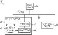 Asecurity device36 protects the access to peripheral28, by monitoring the transactions on the I2C bus and preventing unauthorized transactions in which host24, or another device having bus-master capabilities, attempts to access peripheral28 without authorization.Security device36 is also sometimes referred to as a control device or Trusted Platform Module (TPM). In the present example,security device36 comprises aninterface40 for connecting to I2C bus32, aprocessor44 that is configured to carry out the disclosed techniques, and amemory48 that is configured to store one or more security policies enforced byprocessor44.