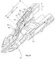 As can best be seen inFIG. 5 the cross-shaped aperture34 a further, essentially rectangular aperture is generally aligned with a furtherrectangular access aperture36 and apentagonal aperture37 in the direction towards the proximal end of theendoscope1. Thecross-shaped aperture34, therectangular aperture36 and thepentagonal aperture37 are separated byrespective bridges38 and39. Thesebridges38,39 do not follow the general curvature of theouter surface17 of thechassis12 but are indented to form a generally V-shapedgroove40 connecting thecross-shaped aperture34 to thepentagonal aperture37 via therectangular aperture36. As can be seen fromFIG. 7, this V-shapedgroove40 in theouter surface17 provides theouter surface17 with a means for guiding one or more movable parts, in particular thecable31 of the Bowden pull between two apertures, such as thecross-shaped aperture34 and thepentagonal aperture37 along theouter surface17 outside of theinterior compartment19. This in turn allows the unsupported free end of thepull wire31 of the Bowden pull arrangement to follow a straight line. At the same time, because the unsupported free end of thepull wire31 passes from theinterior compartment19 of thechassis12 to the exterior via thecross-shaped aperture34, thepull wire31 becomes easily accessible for the assembly tools, in particular the crimping tool. The cross-shape of the cross-shaped aperture, in turn, facilitates the use of the tools by providing the necessary space for opening and closing the tools, be it a crimping tool or a holding tool.