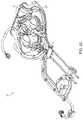 FIG. 29 shows a perspective view of ablood circuit assembly17 in an alternate embodiment. This embodiment is different from that shown inFIGS. 18 and 19 in a few ways. For example, in this embodiment, theblood lines203 and204 have a cross section having a shape similar to a “figure 8” in which one portion of the “figure 8” includes a lumen to carry blood or other fluid, and another portion of the “figure 8” carries a conductor. That is, theblood lines203 and204 include a lumen through which blood and other fluids may flow, and another lumen through which an electrical conductor may pass. Further detail regarding this and other arrangement is provided below with reference toFIGS. 37-49. As also discussed in more detail below, the electrical conductor may be used to detect disconnection of ablood line203,204 from a patient or other connection point. Additionally, the organizingtray171 inFIG. 29 is different from that shown inFIG. 19 in that theengagement members174 may include a slot or hole that theblood lines203,204 are engaged with, but in this embodiment, theengagement members174 need not engage theblood lines203,204 so as to resist pulling of thelines203,204 downwardly, e.g., for mounting the lines in an occluder. Instead, in this embodiment, theblood lines203,204 may be allowed to move freely with respect to theengagement members174. Another modification in the embodiment is that theengagement members174 include a push plate that spans across bothlines203,204. This is in contrast to the arrangement inFIG. 19 where eachline203,204 is engaged byengagement members174 that are independent of each other. The arrangement inFIG. 29 may provide an advantage in some embodiments that allows a user to engage thelines203,204 with respect toslots517 that lead to an occluder in an single operation. (SeeFIG. 22) In one embodiment, theslots517 may each be associated with an air detector that operates to detect whether there are air bubbles in thelines203,204 (e.g., by optical detection or other so that air in aline203 or204 can be detected by a respective air detector in one of the slots517). Thus, theengagement members174 may function to associate the lines with an air detector or other feature in addition to, or instead of, an occluder or other arrangement that positions thelines203,204 in a desired way. In this embodiment, the engagement features174 include slots arranged on an underside of the push plate that engage with a narrower portion of thelines203,204 (e.g., the portion that carries the electrical conductor) so as to position the conductor near the push plate. This may help position thelines203,204 in theslots517 in such a way that the conductor does not interfere with an air detector operating to detect air in thelines203,204. As mentioned above, the slots on the push plate that engage with thelines203,204 may engage the lines so that the lines do not rotate relative to the push plate, but are allowed to move along their length relative to the push plate.FIG. 30 shows a closeup view of a portion of the blood circuit assembly ofFIG. 29 and illustrates how a portion of the organizingtray171 may be arranged to at least partially conform to the shape of ablood line203,204 held by thetray171. Similar to theengagement members174, thetray171 portions that engage with thelines203,204 may be arranged to orient thelines203,204 so that the conductor portion of the line faces outwardly. This may help properly position thelines203,204 for theengagement members174 or other portions of theassembly17.