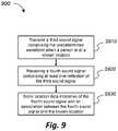 FIG. 9 is a flow diagram of acalibration method900 in which a playback device (e.g., theplayback device410 ofFIGS. 4 and 5) is prepared for being used to determine a location of a person using stored location data. The playback device transmits, at S910, a third sound signal containing a predetermined waveform, when a person is at a known location relative to the playback device. In some examples, a user may specify a known location within a playback environment, for example using a control device (e.g., the control device130aofFIG. 1H) connected via a network to the playback device. In other examples, a user may be directed to position themselves in a predetermined known location, for example by providing an instruction to the user. Such an instruction may be audible, transmitted by a playback device or any other device in the playback system which is capable of audio reproduction. Such an instruction may be visual, for example using a display on the control device or other device in the playback system. Examples of known locations may include sitting on a particular chair, sitting in a particular position on a particular sofa, and standing in a doorway. Known locations may also be expressed in terms relative to a particular playback device or group of playback devices, such as “center” or “off-center”, “left” or “right”, and so on. It will be appreciated that if a person is determined to be sitting in the chair, the person may, in fact, be standing in front of the chair. In this way, each known location is associated with a region of the playback environment.
