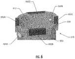 Thecartridge500 of the depicted implementation includes amouthpiece510 that is defined by anouter mouthpiece wall512 that includes aproximal end514 with anexit portal515 defined therein, and adistal end516 that engages theproximal end506 of thetank502. In the depicted implementation, themouthpiece wall512 includes aflange550 positioned between theproximal end514 and thedistal end516 thereof. Thecartridge500 of the depicted implementation also includes ametal plate552, which is disposed below theflange550. In the depicted implementation, themetal plate552 is affixed to the bottom of theflange550 of themouthpiece510 via an adhesive, although in other implementations other methods of attachment are possible, including, for example, via an insert molding process. In various implementations, themetal plate552 may comprise any material configured to be attracted by a magnet, such as various ferromagnetic materials, including, but not limited, to iron, nickel, cobalt, alloys such as steel, and/or any combination thereof. Thecartridge500 also includes a pair ofconductive plugs525A,525B located on opposite sides of themouthpiece510 and below theflange550 andmetal plate552. In the depicted implementation, theconductive plugs525A,525B may be affixed inside themouthpiece510 of thecartridge500 via an adhesive, although in other implementations other methods of attachment of possible, including, for example, via an insert molding process. In the depicted implementation, theconductive plugs525A,525B are operatively connected to a heater520 (seeFIG. 5) of thecartridge500. In various implementations, theconductive plugs525A,525B may be constructed of any electrically conductive material, including, for example, but not limited to, copper, beryllium copper, aluminum, platinum, gold, silver, iron, steel, brass, bronze, graphite, conductive ceramic materials, and/or any combination thereof.