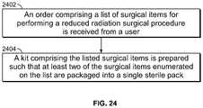 FIG. 24 is a flowchart illustrating a method of making a reduced radiation kit for performing a reduced radiation percutaneous procedure, in accordance with an embodiment of the present specification. Atstep2402 an order comprising a list of surgical items for performing a reduced radiation surgical procedure is received from a user. In an embodiment, the surgical items are selected from a group consisting of a guidewire, a needle, a sticker, a balloon catheter, a stent, a sheath, a contrast agent, and a basket catheter. At step2404 a kit comprising the listed surgical items is prepared such that at least two of the surgical items enumerated on the list are packaged into a single sterile pack. The surgical items are “reduced radiation surgical items” because the surgical items are adapted for use in a reduced radiation application.