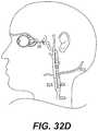 With reference toFIG. 32B, one of the oculofacial arteries such as the STrA or SOA may be accessed adjacent the eyebrow to navigate devices in a retrograde direction directly to the OA as shown by the dotted line. With reference toFIG. 32C, the STA may be accessed adjacent the ear to navigate devices in a retrograde direction down the ECA, around the carotid bifurcation at the CCA, then in an antegrade direction up the ICA to the OA as shown by the dotted line. With reference toFIG. 32D, the OcA may be accessed adjacent the occipital bone to navigate devices in a retrograde direction in the OcA, down the ECA, around the carotid bifurcation at the CCA, then in an antegrade direction up the ICA to the OA as shown by the dotted line. Each of these access sites is relatively superficial allowing identification using digital palpation or transdermal doppler ultrasound, percutaneous access without the need for a cut-down, and relatively simple closure by manual compression or by a compression device wrapped around the head.