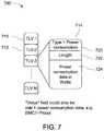 FIG. 7 shows an example of adiscovery packet700 containing consumed power data from one of the system nodes such asnodes622,624, or626 (shown inFIG. 6). In this example, thediscovery packet700 may be formatted according to a public networking protocol such as link layer discovery protocol (LLDP) or according to a proprietary protocol such as Cisco Discovery Protocol (CDP). Thediscovery packet700 includes a sequence of time length value (TLV)structures710,712 and714. Each of the timelength value structures710,712 and714 include an organizationally defined information string. In this example, one of theTLV structures714 includes atype field720, alength field722 and apower consumption field724. In this example, thetype field720 includes a code indicating power consumption, thelength field722 includes data indicating the length of the TLV, and thepower consumption field724 includes the power consumption value from the system node that sent thediscovery packet700.