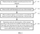 In an optional implementation of this embodiment, a network access mode of the terminal may be determined according to the predicted Internet access fee of the at least one available network access mode, the radio frequency power consumption, and the network service quality. For example, for each type of accessed content, the delay is selected to represent the network service quality; a predicted Internet access fee, the radio frequency power consumption, and the delay are used as network selection parameters; a weight value corresponding to each network selection parameter is determined according to a user policy; a weighted sum is calculated and used as a network decision indicator; and the network selection policy is determined according to network decision indicator values corresponding to various network access modes. A network decision indicator value of the ithnetwork access mode is: