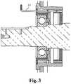 InFIG. 3, the first support element is shown in the support position. Awrench32 is shown in engagement with the first fastening member. Rotation of the fastening members displace the first support element parallel to the centre axis into the support position, where the first support element is wedged between the respective engagement parts of the stator and the rotor.