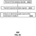 FIG. 44 illustrates a flow diagram of an example, non-limiting embodiment of amethod4400 for sending and/or receiving electromagnetic waves representative of communications. At4402, communications can be determined that are to be wirelessly transmitted. As an example, the communications can be based on received signals. In another embodiment, the communications can be based on information generated by a processor co-located at the communication device that is to transmit the signals.