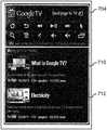 InFIG. 7B, thecontrol panel704 is an example of a user control panel, through which a user selection of a media entity, and a remote control command modifying display of media content, are sent from theclient102 to the TV and/orSTB106. For example, thecontrol panel704 allows a user to control the paired TV using conventional remote control functionality, use connected features of the STB or TV (such as features provided by Google TV, including searching for content and accessing the Google TV home screen). Thecontrol panel704 also enables a user to send an item of media content (selected from the media entities returned by the server) to the connected TV or STB for display through use of a “Send page to TV” button.