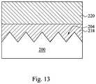 Reference is made toFIG. 13. Afirst epitaxial layer218 is formed at least in therecesses204, and asecond epitaxial layer220 is formed on thefirst epitaxial layer218. Thefirst epitaxial layer218 and/or thesecond epitaxial layer220 are made of a material or materials which have lattice mismatches to thesubstrate200. In some embodiments, thefirst epitaxial layer218 and/or thesecond epitaxial layer220 are made of germanium. The lattice mismatch between germanium and silicon is about 4%. In other embodiments, thefirst epitaxial layer218 and/or thesecond epitaxial layer220 are made of an III-V compound or III-V compounds. The lattice mismatch between an III-V compound and silicon is in a range from about 8% to about 12%. Therefore, if therecesses204 were absent from thesubstrate200, thefirst epitaxial layer218 and/or thesecond epitaxial layer220 might have epitaxial defects due to the lattice mismatch between thefirst epitaxial layer218 and thesubstrate200. The epitaxial defects may be, for example, threading dislocations (TDs).