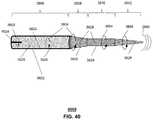 FIG. 40 illustrates anotherpolyrod antenna4000 having features similar to the features ofpolyrod antenna3800 which have the same reference numbers.Polyrod antenna4000 can provide an alternative embodiment to theMMICs3824 for generating theelectromagnetic wave3802. For example, theMMICs3824 can be avoided by providing one ormore radiating elements4024 in thewaveguide3822. In one embodiment, the first region3806 (of the core3828) within thewaveguide3822 can be filled with adielectric material4026. In one embodiment, thedielectric material4026 extends to theinner surface3823 of thewaveguide3822. The firstelectromagnetic wave3802 generated by the radiating element(s)4024 can transition into a secondelectromagnetic wave3804 that propagates within thecore3828 in thefirst region3806 covered by thewaveguide3822. Theinner surface3823 of thewaveguide3822 can confine the secondelectromagnetic wave3804 within thecore3828. As described above, thefourth region3812 of thecore3828 can be configured (e.g., tapered) for transmitting wireless signals based on the secondelectromagnetic wave3804.