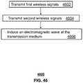 FIG. 46 illustrates a flow diagram of an example, non-limiting embodiment of amethod4600 for sending and/or receiving electromagnetic waves representative of communications. At4602, a communication device can utilize an antenna array to transmit first wireless signals that are associated with communication signals. The first wireless signals can be directed via beam steering by the antenna array towards a wireless receiver of another communication device. The communication signals can represent various types of information, including control information, voice, video, data, messaging, and so forth. At4604, the communication device can transmit second wireless signals associated with the communication signals. The second wireless signals can be directed via the beam steering by the antenna array towards a transmission medium, such as a power line. The first and second wireless signals can be transmitted at a same time or in temporal proximity to each other.