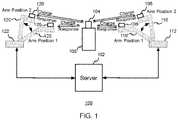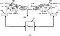 Shown are two arm positions (labeled “Arm Position1” and “Arm Position2”) ofrobot arm120. TheRFID reader126 sends a charge or charging signal to theRFID tag104, and theRFID tag104 sends a response to theRFID reader126. This charge-response exchange occurs at different positions of therobot arm120.