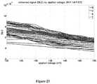 FIG. 30 shows a plot of current through the nanopore (solid lines) and applied voltage (dashed lines) versus time. The current can decrease when a molecule is captured in thenanopore3005. As the applied voltage is decreased overtime3010, the current decreases until the molecule falls out of thenanopore3015, at which time the current increases to the expected level at the applied voltage. The applied voltage at which the molecule falls out can depend on the length of the molecule. For example, a tag having 30 bases can fall out around 40 mV, while a tag having 50 bases can fall out around 10 mV. There can bevariation3020 in the fall-out voltage for different nanopores or for different measurements on the same nanopore over time. Adjusting this fall-out voltage to an expected value can make the data easier to interpret and/or more accurate.