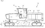 Operator'splatform24 is covered by aprotective canopy structure42 that is liftable and lowerable by means of amovement guidance system50 and encompasses aprotective canopy44 that is connected tomachine frame12 ormachine body13 respectively via afront panel arrangement46 and arear partition arrangement48.