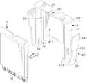 As mentioned above, for the purpose of pulling thefastening frame2 out of theelectric connector3, the twoadjustment members25 can have protrudingparts252 disposed op two opposite outer sides thereof, respectively, and configured to serve as fulcrums for applying force to pull thefastening frame2 out of theelectric connector3, and the user can apply force, by two fingers thereof, to press the releasingparts263 of the two fastening spring clips26 from an outwardly-titled status to a vertical status, and then move thefastening parts262 of the fastening spring clips26 out of thefastening grooves322 of thearms32, so that thefastening frame2 can be vertically and upwardly pulled out of theelectric connector3. Next, the user can pull theedge card1 out of theaccommodating groove211 of thefastening frame2, to complete the operation of disassembling theedge card1.