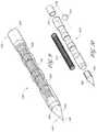 FIG. 32 shows another embodiment of asystem2800 that can be used to perform a variety of methods or procedures. A spring-loadedpusher system2800 can be used for delivery of a shunt. The spring-loadedpusher2810 preferably includes abutton2820 operably connected to a hingedrod device2830. Thedistal portion2835 of the hingedrod device2830 engages adepression2840 in the surface of thepusher2810, keeping thespring2850 of thepusher2810 in a compressed conformation. When the user pushes downwards2860 on thebutton2820, thedistal portion2835 of the hingedrod device2830 is disengaged from thedepression2840, thereby allowing thespring2850 to decompress, thereby advancing thepusher2810 forward.